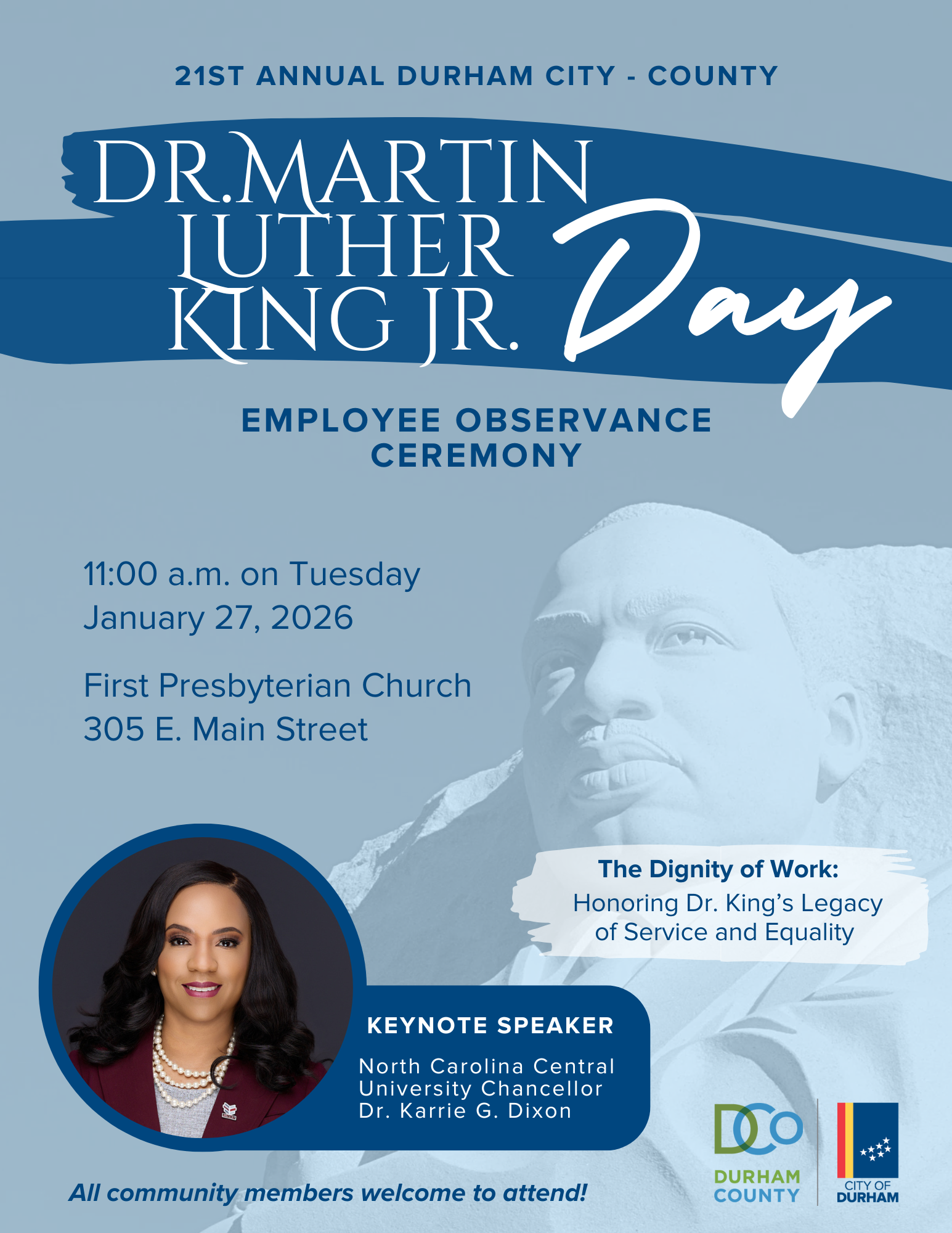 Honoring the life and legacy of Dr. Martin Luther King, Jr. is the purpose of the annual Durham City-County Martin Luther King, Jr. (MLK) Employee Observance. The celebration, jointly hosted by the City of Durham and Durham County, will take place on Tuesday, January 27, 2026. The event will begin at 11 a.m. inside First Presbyterian Church located at 305 E. Main Street in downtown Durham.